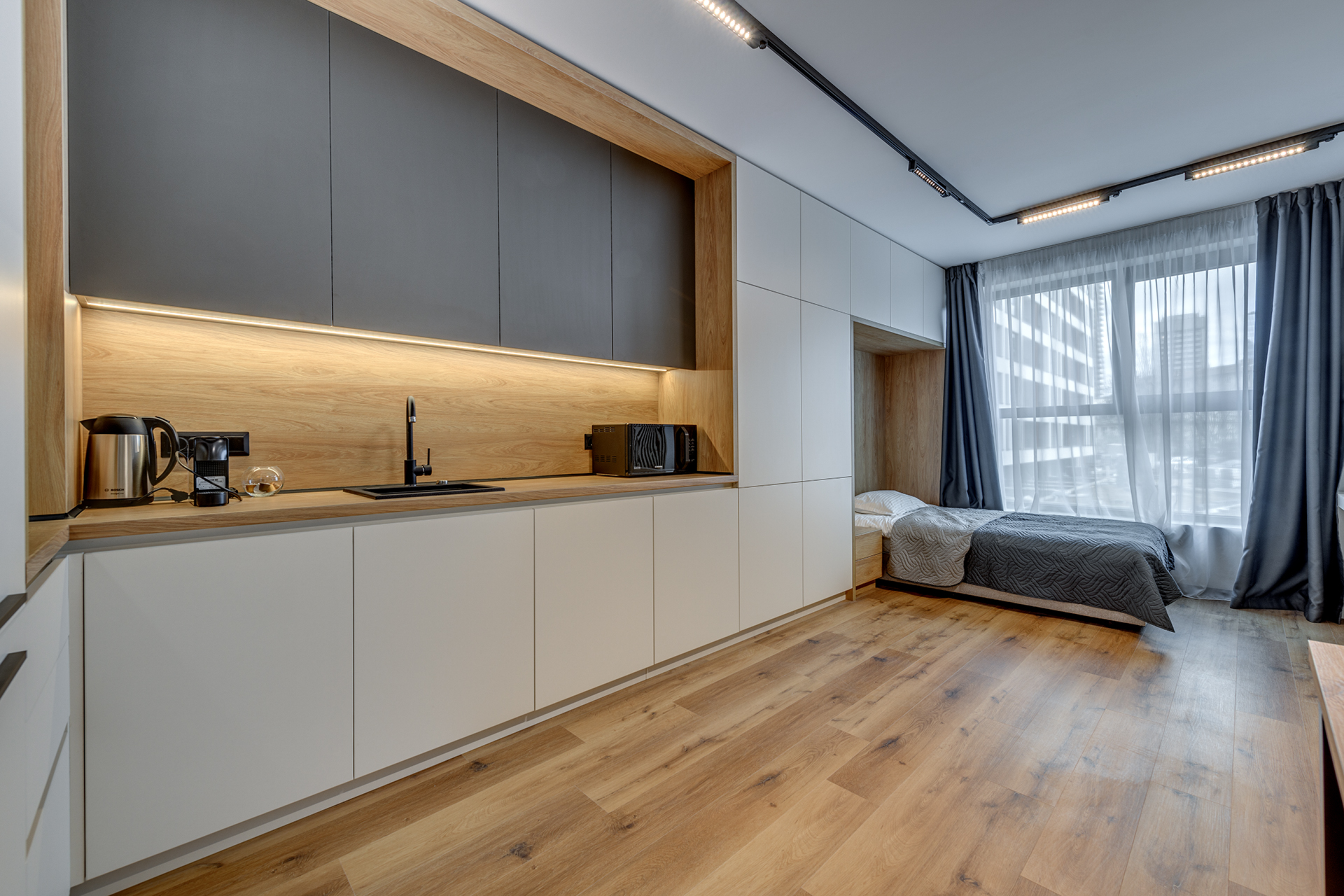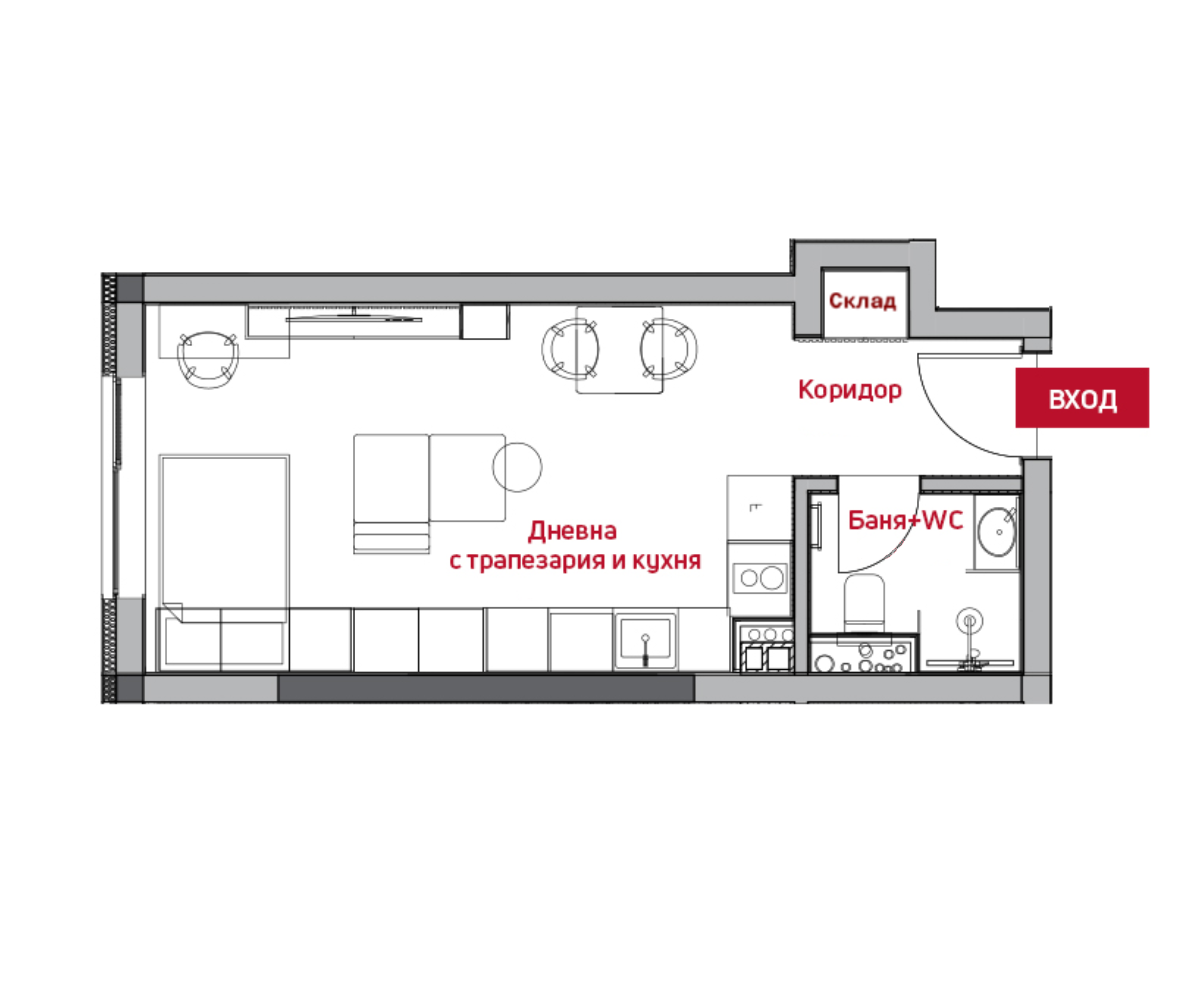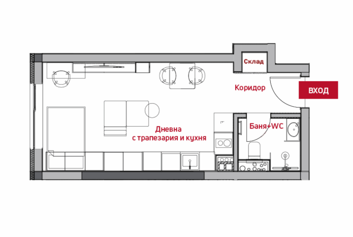 This is a one-bedroom apartment designed with attention to detail and maximum efficient use of space. It features entrance with a dining room and kitchen, a living room including a small sleeping area and a bathroom with toilet.
