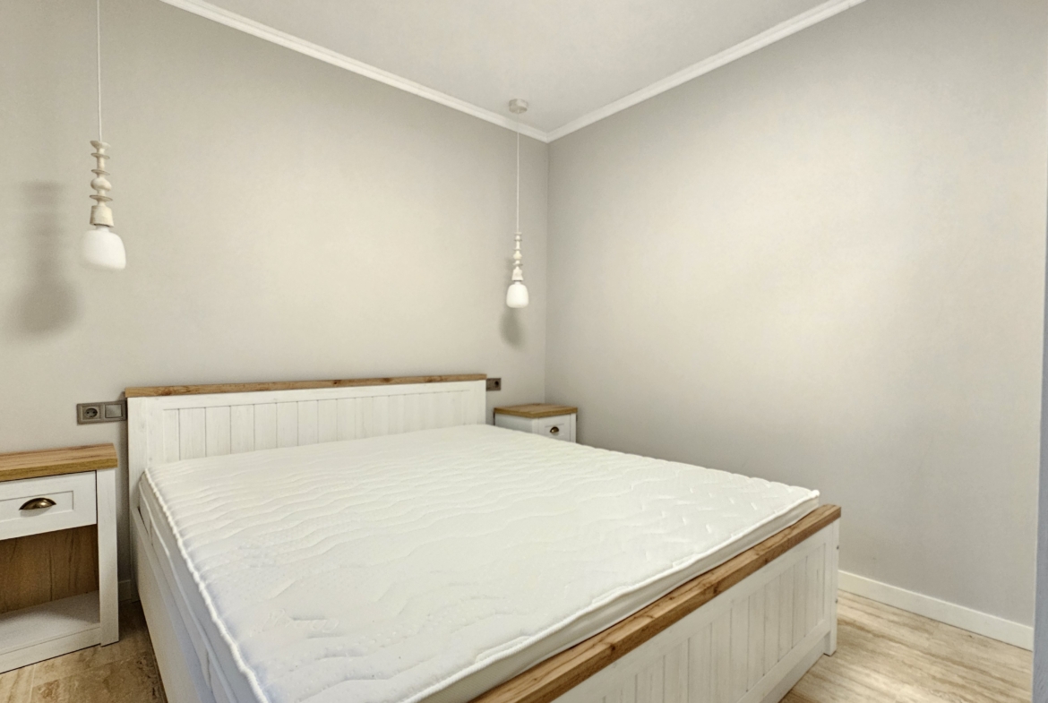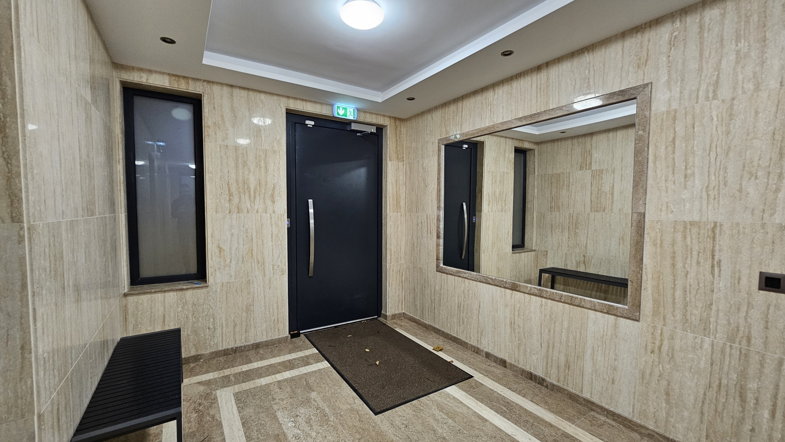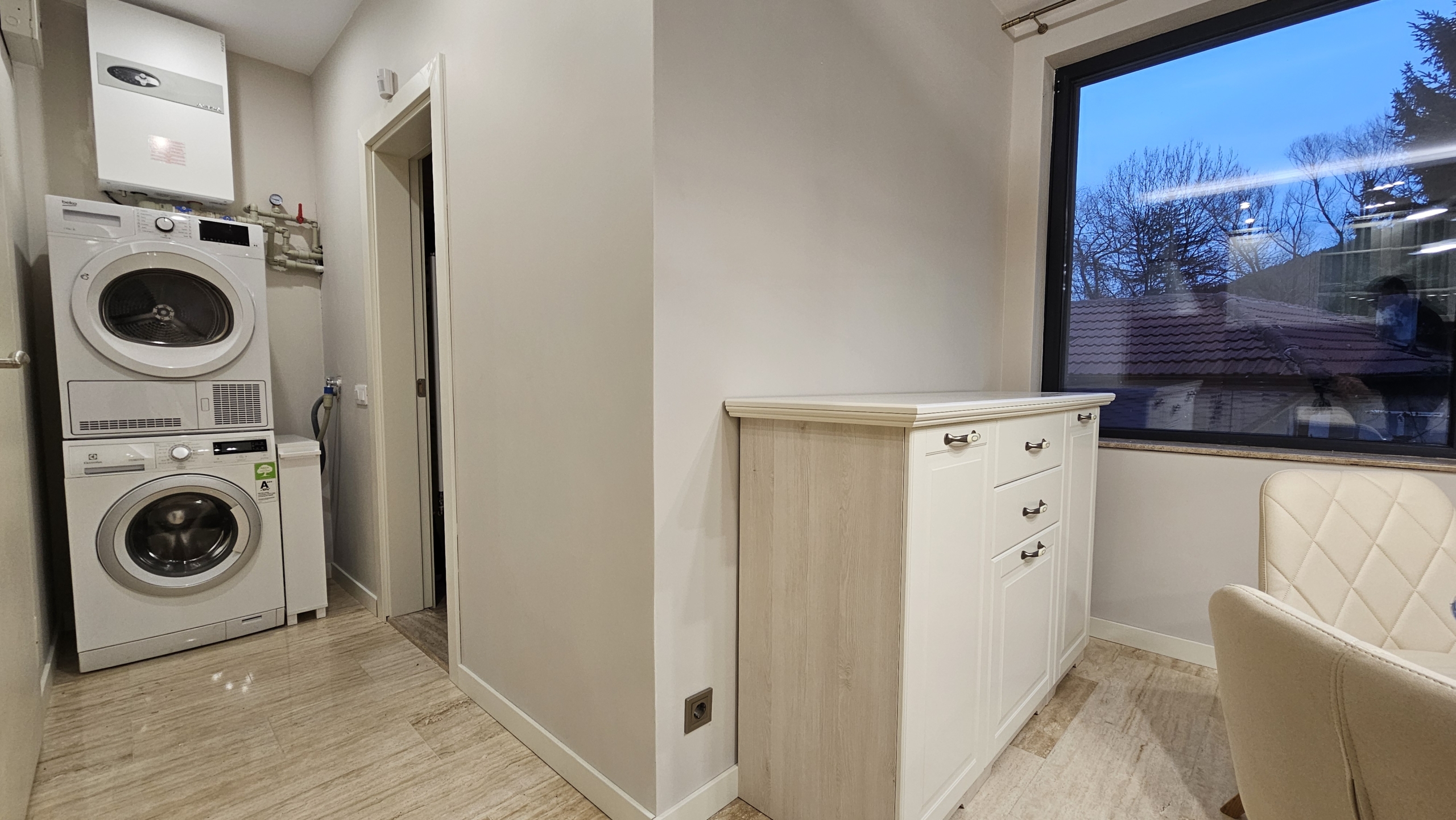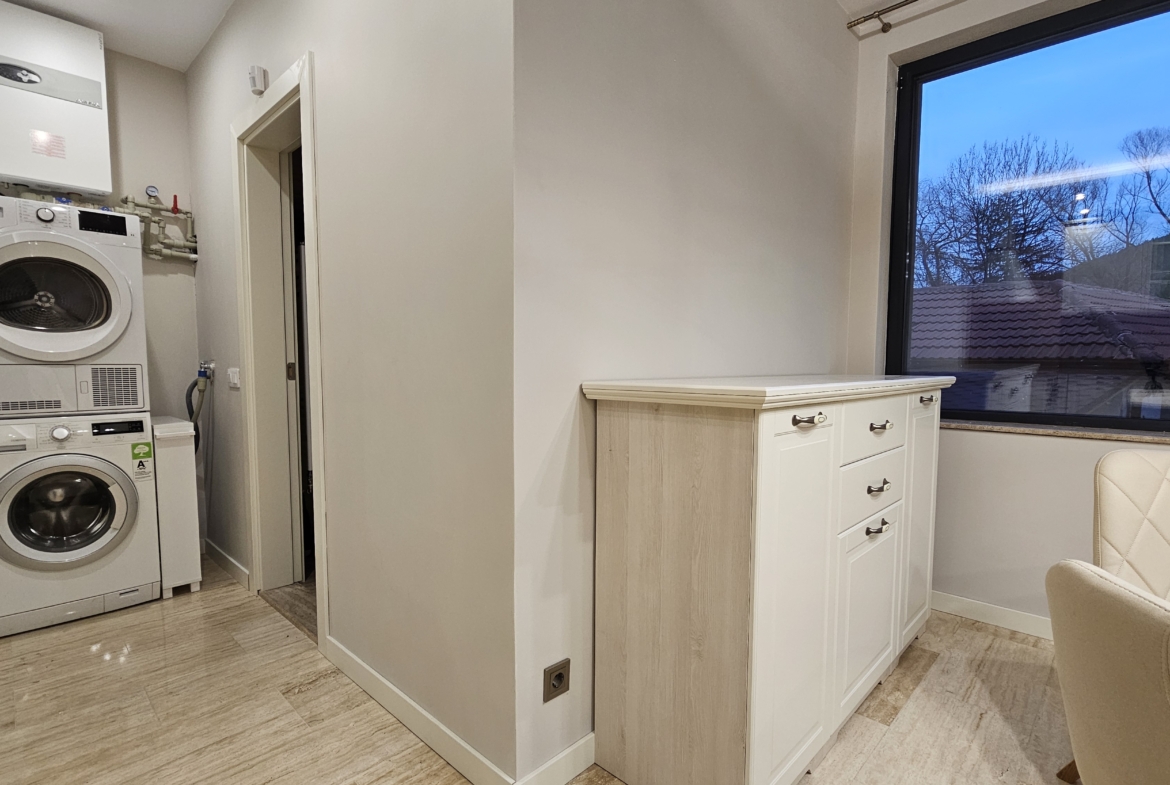 The apartment is equipped with access control, external roller blinds and luxurious common areas. There is an option to rent an above-ground garage with two parking spaces (40 sq m in total) for €150 per month.