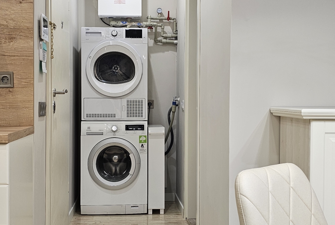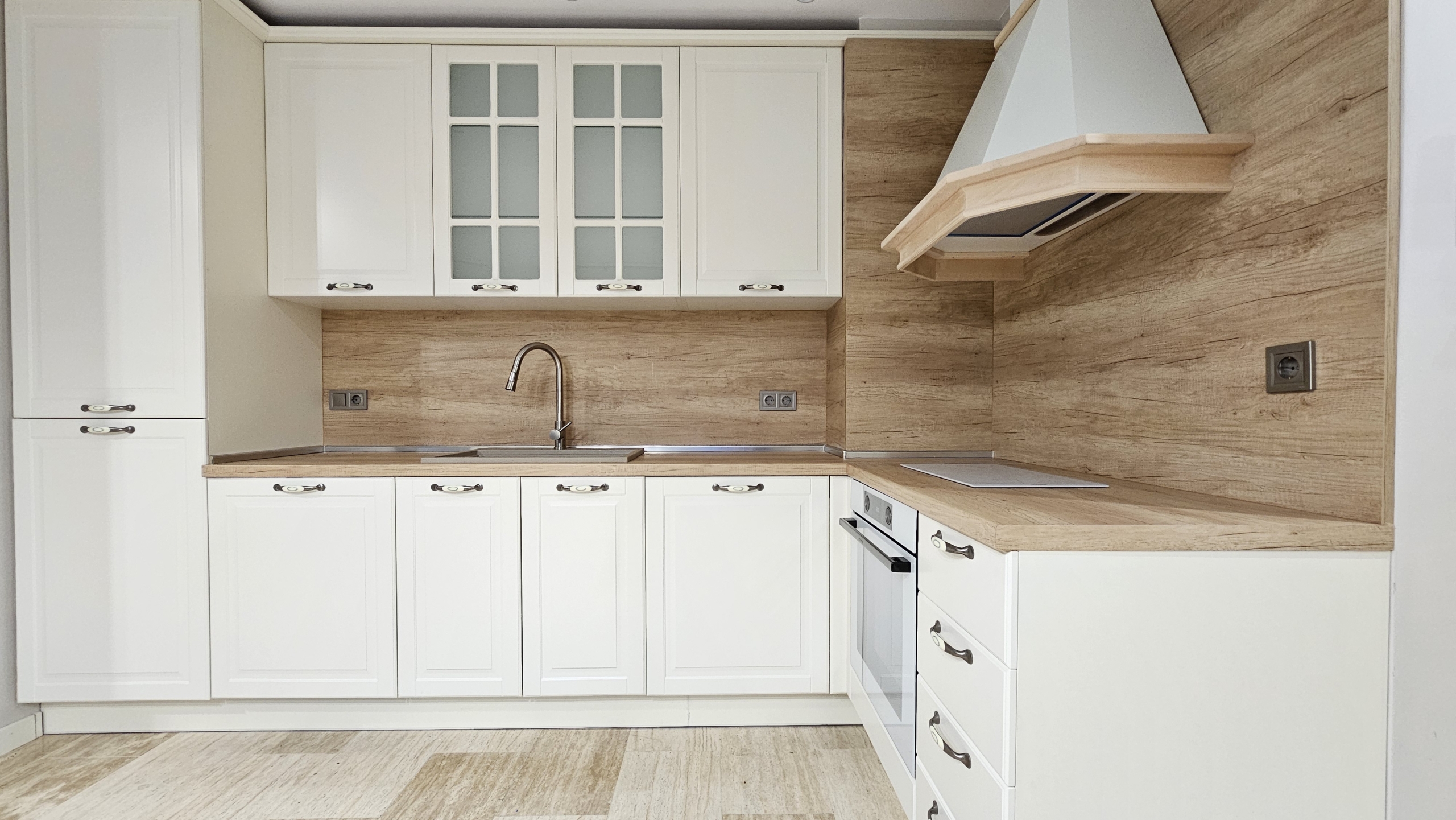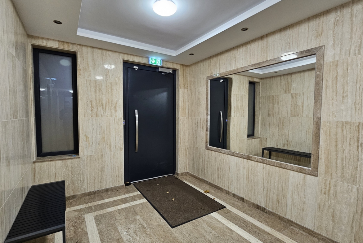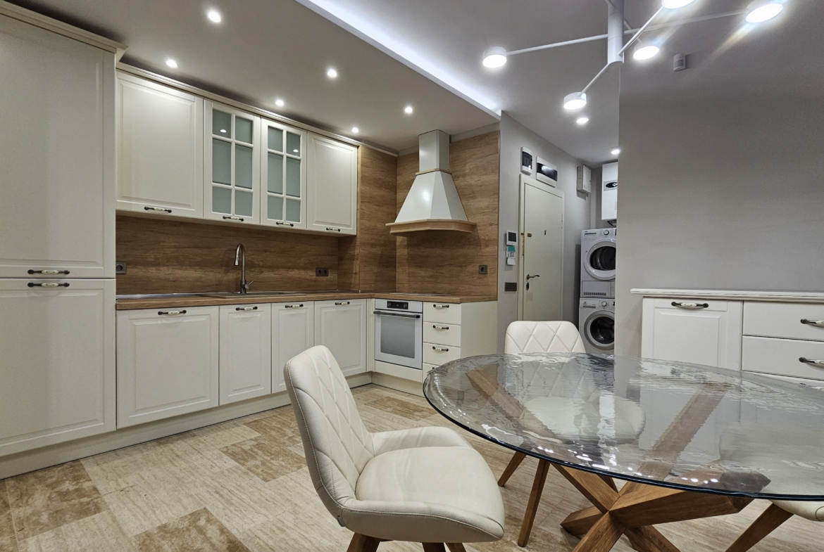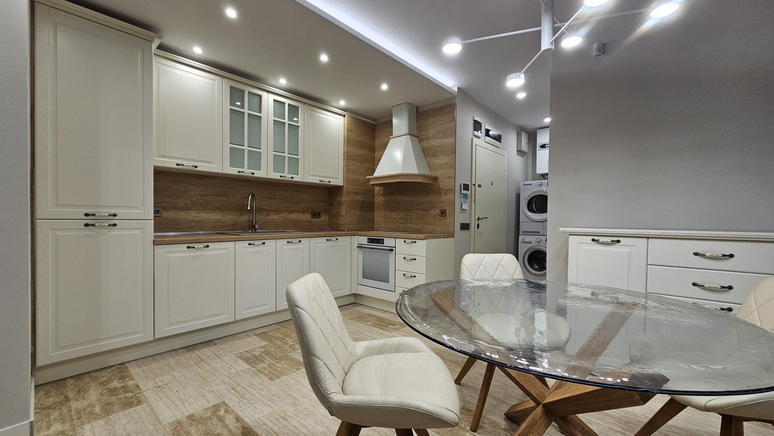 The apartment is equipped with access control, external roller blinds and luxurious common areas. There is an option to rent an above-ground garage with two parking spaces (40 sq m in total) for €150 per month.