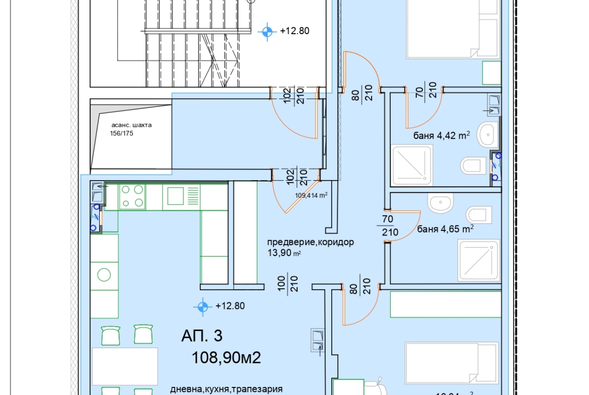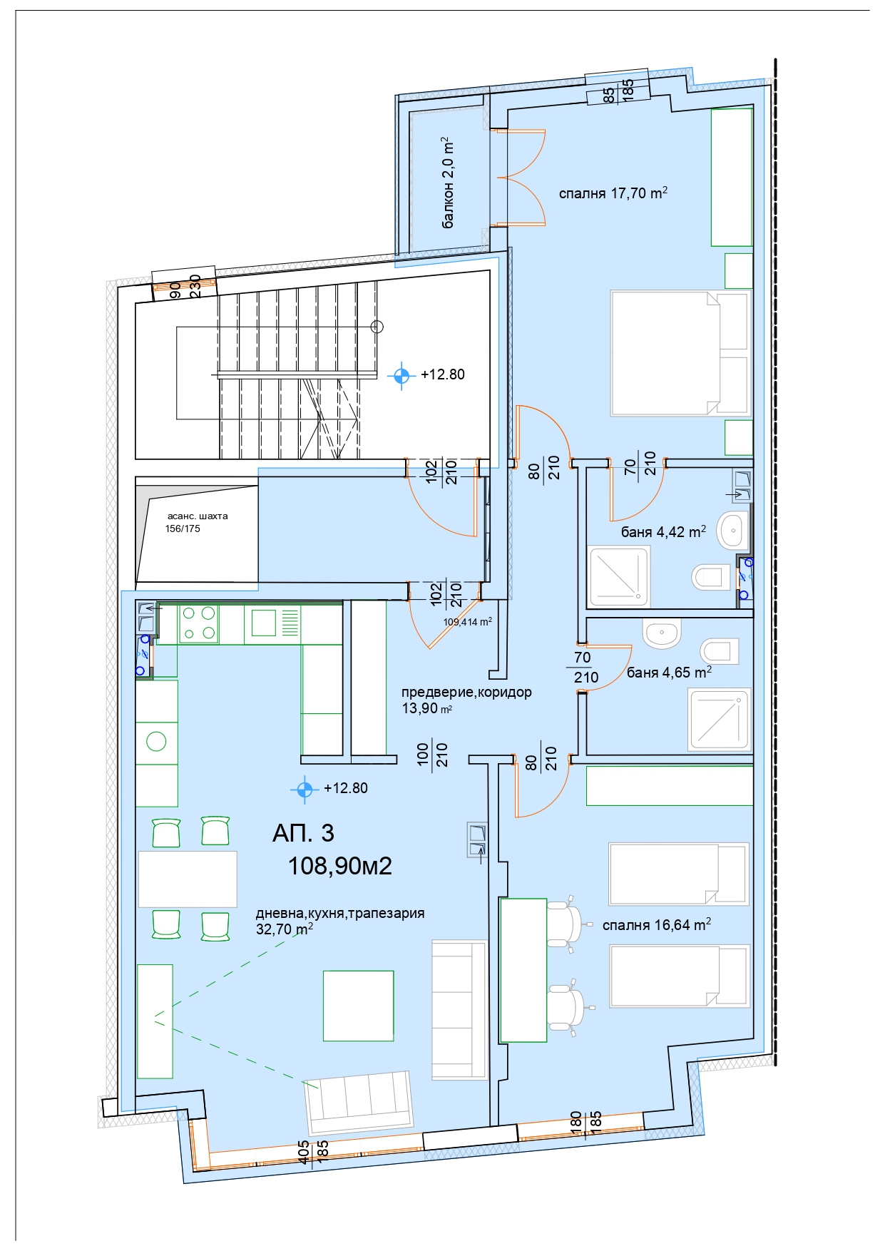 - Total area: 133.21 sq.m (built-up area – 108.9 sq.m + common areas – 24.31 sq.m)