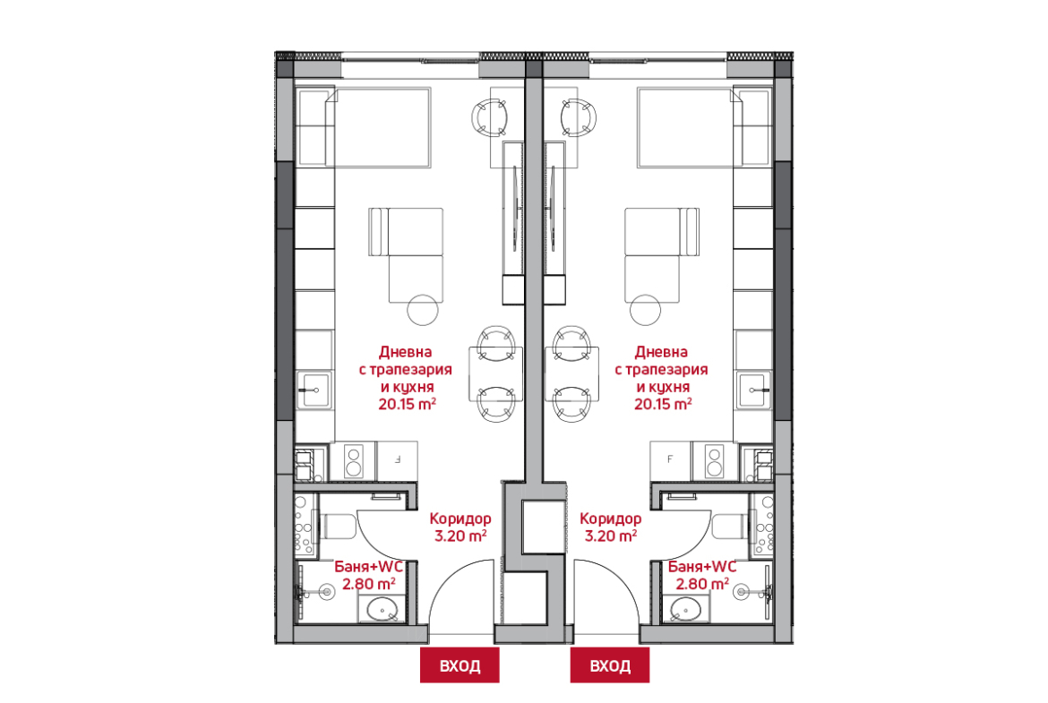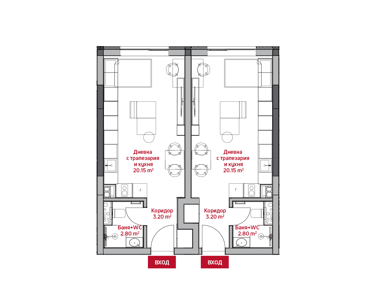 Each of the two identical one-bedroom apartments is designed for maximum efficient use of space: Corridor: 3.20 sq.m., Common room: 20.15 sq.m., including a living room with a sleeping area, a dining room and a kitchen, Bathroom with toilet: 2.80 sq.m.