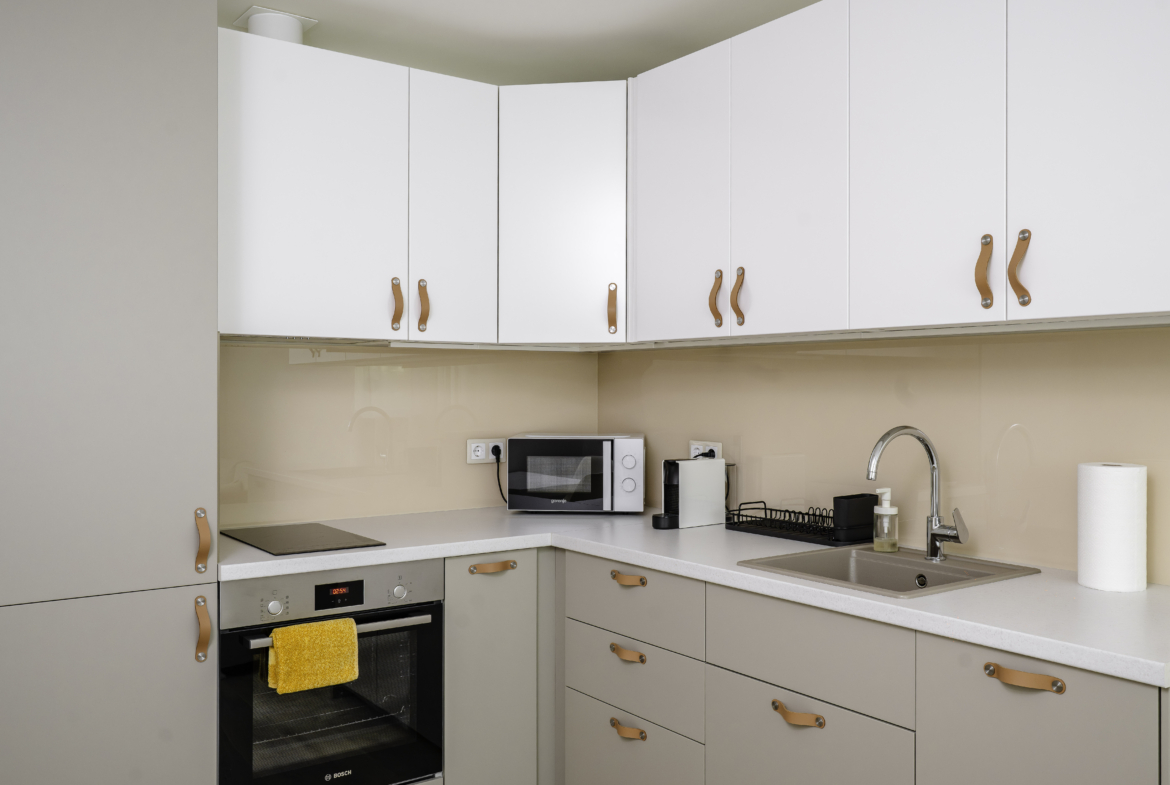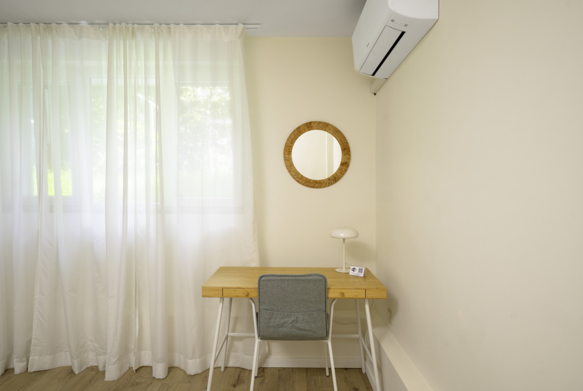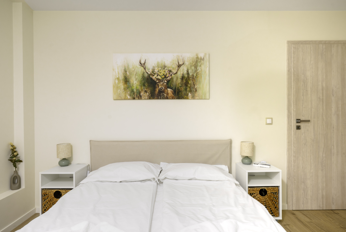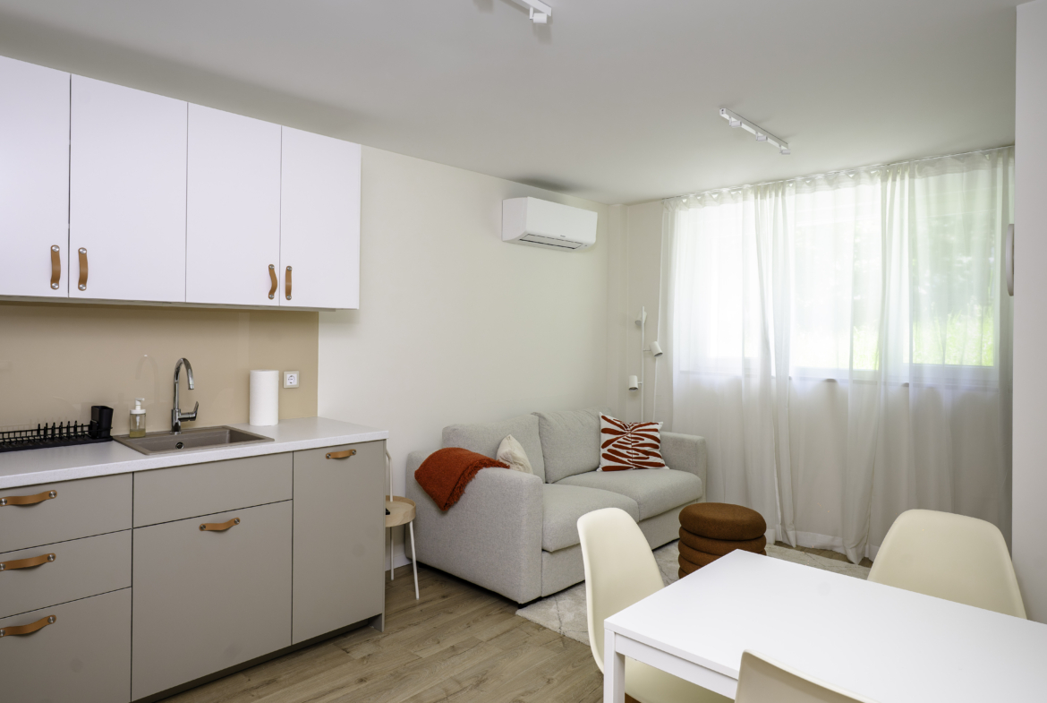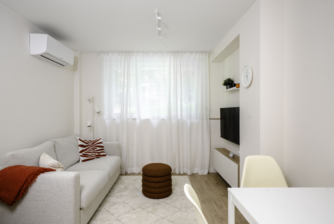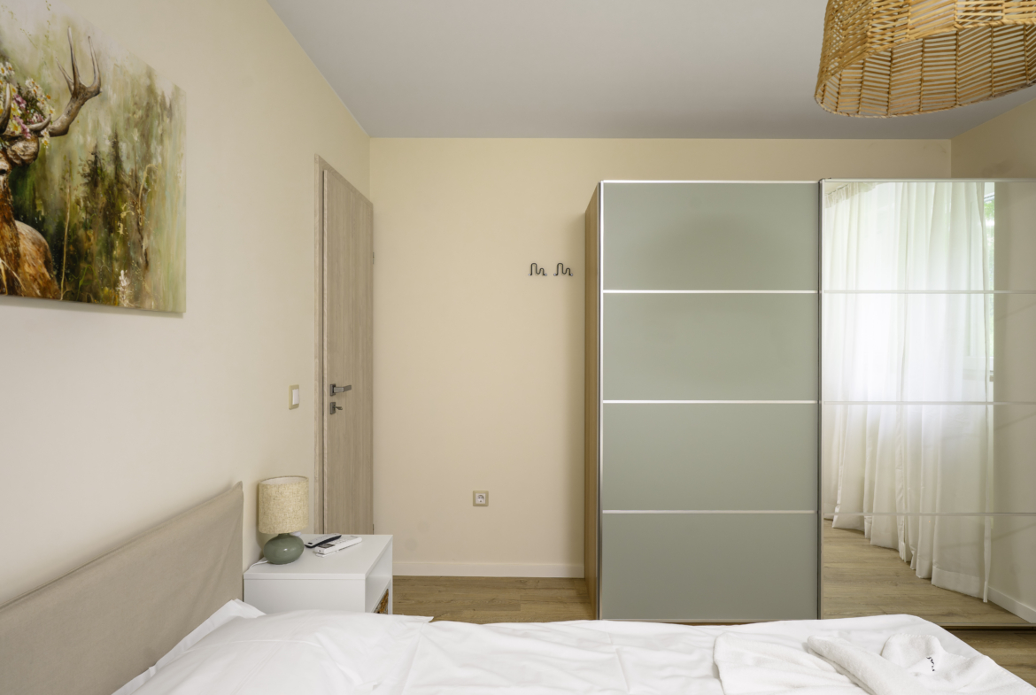 Апартаментът се отличава с топла и приветлива атмосфера, съчетавайки модерно обзавеждане и функционалност. Разполага с комфортна всекидневна, напълно оборудвана кухня и отделна спалня, която осигурява спокойствие и уединение. Има също специално обособено работно място, което го прави идеален избор за хора, които работят дистанционно.
