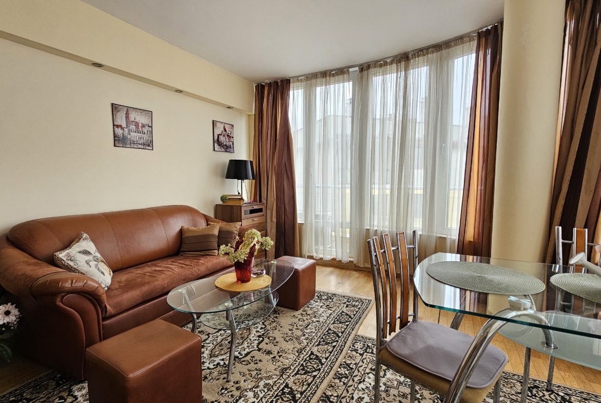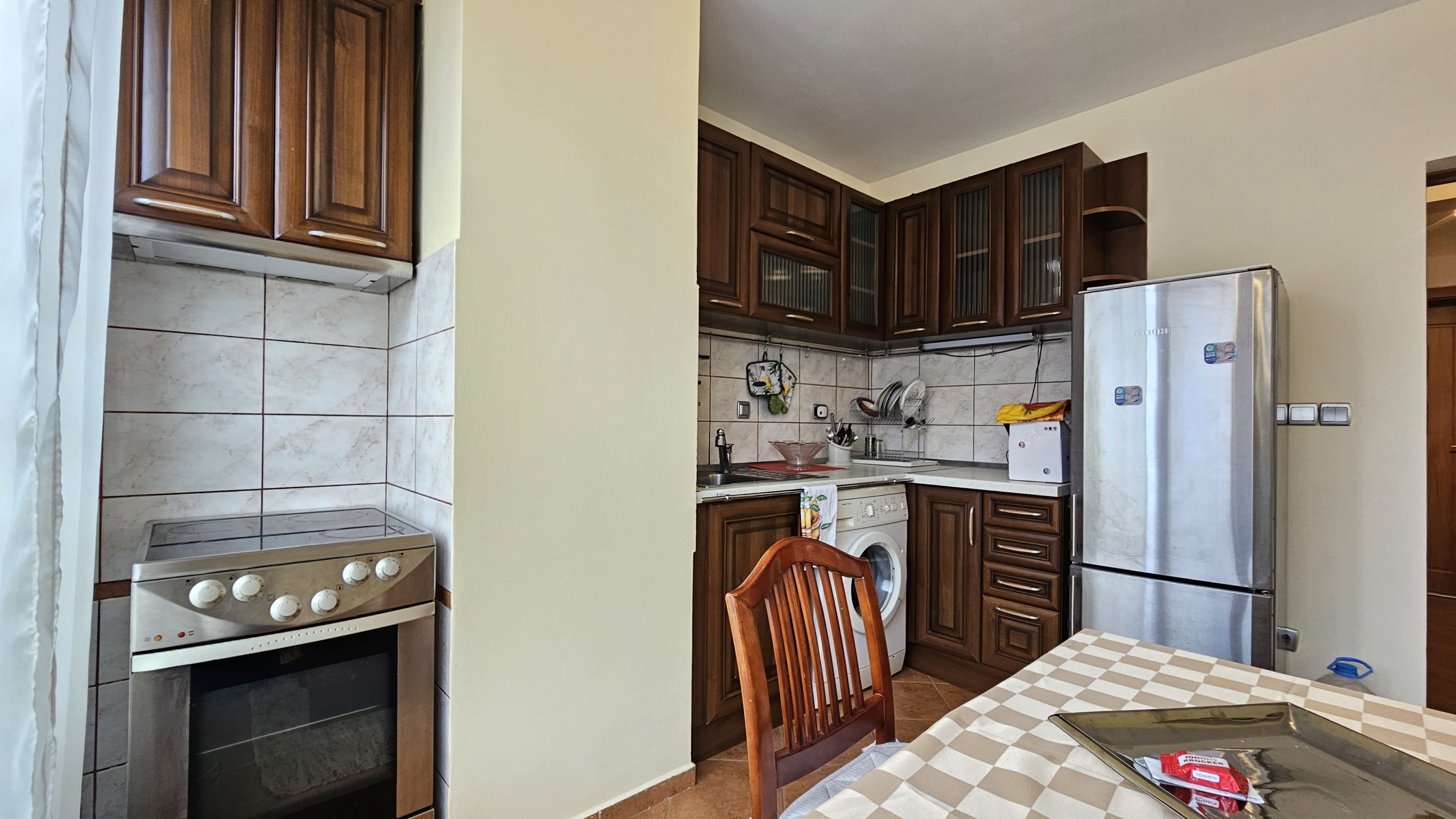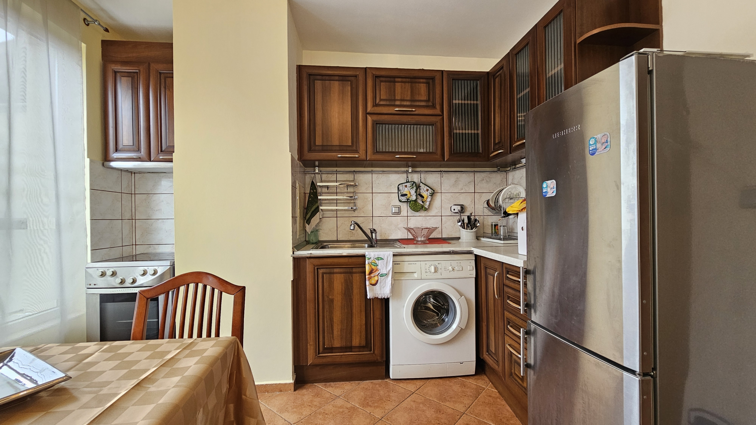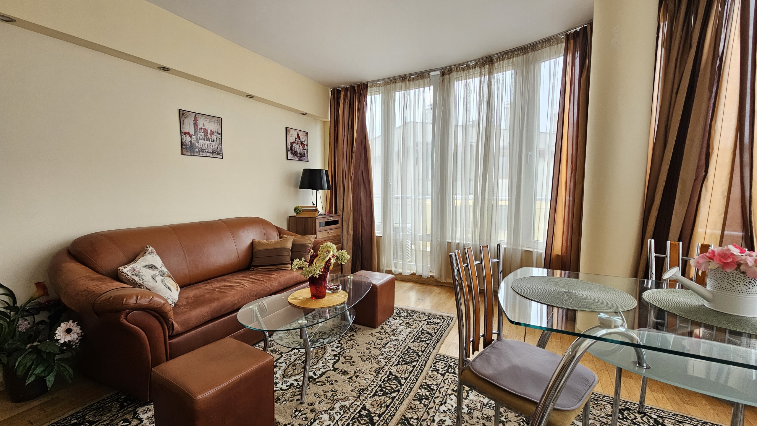 Апартаментът се отдава напълно обзаведен и оборудван с основни електроуреди. Интериорът е в светли тонове, което придава усещане за простор и уют.