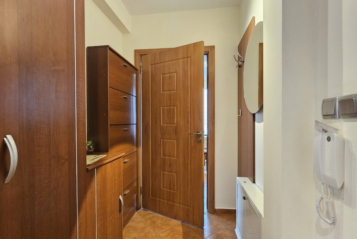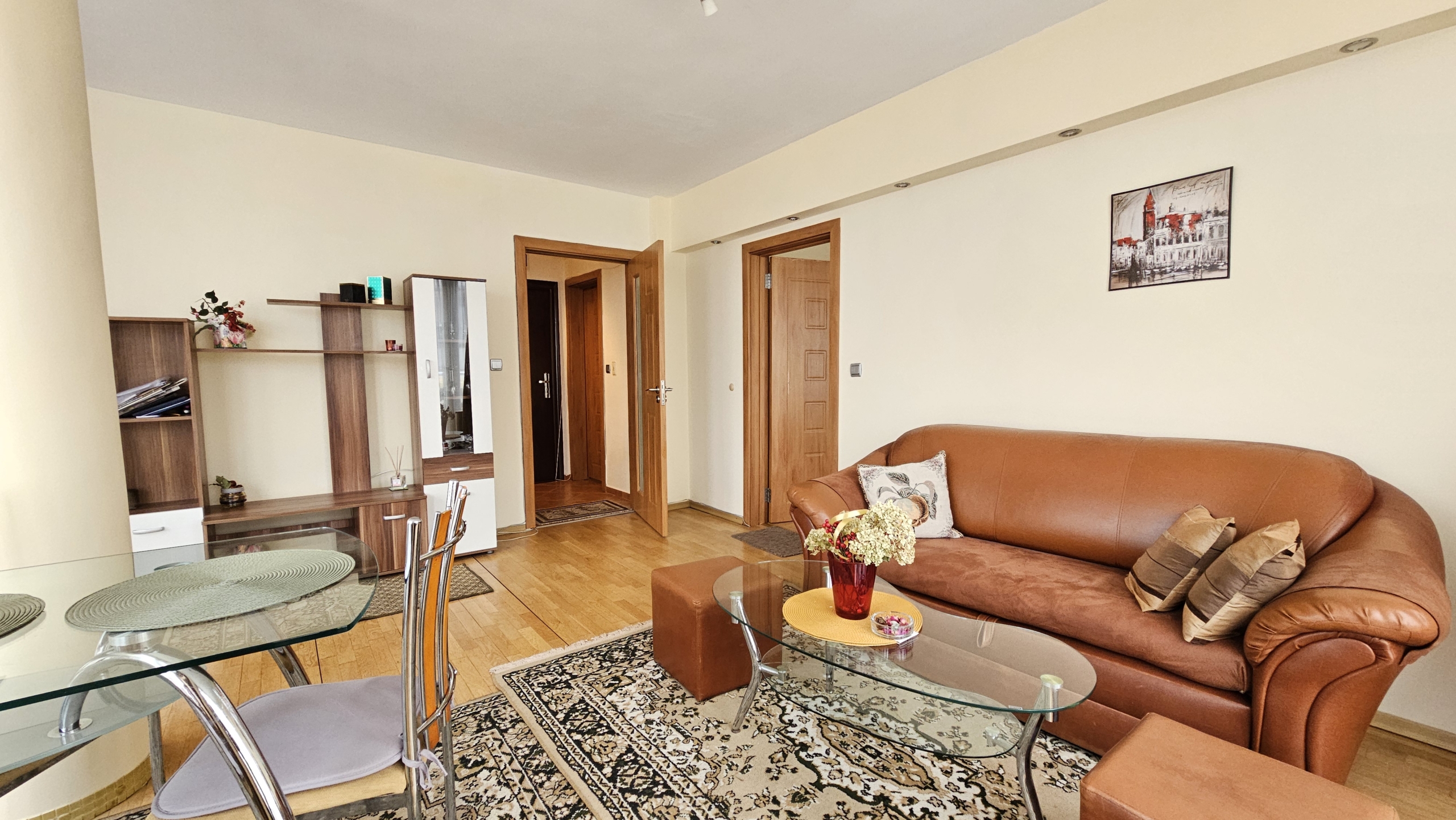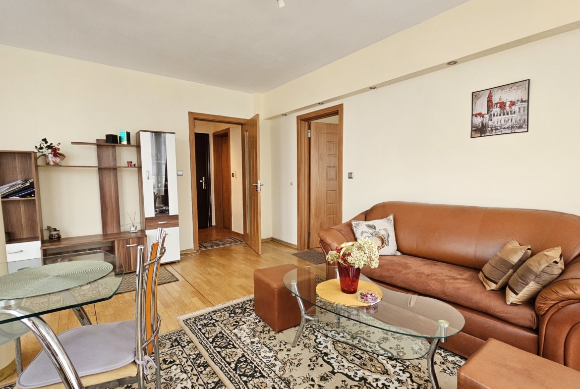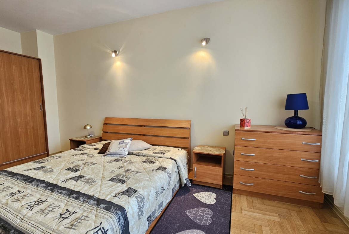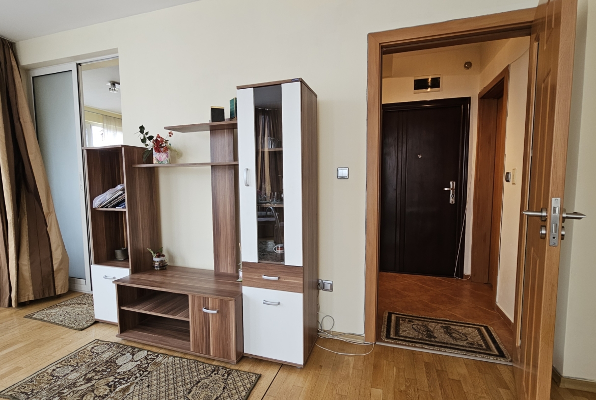 Апартаментът се отдава напълно обзаведен и оборудван с основни електроуреди. Интериорът е в светли тонове, което придава усещане за простор и уют.