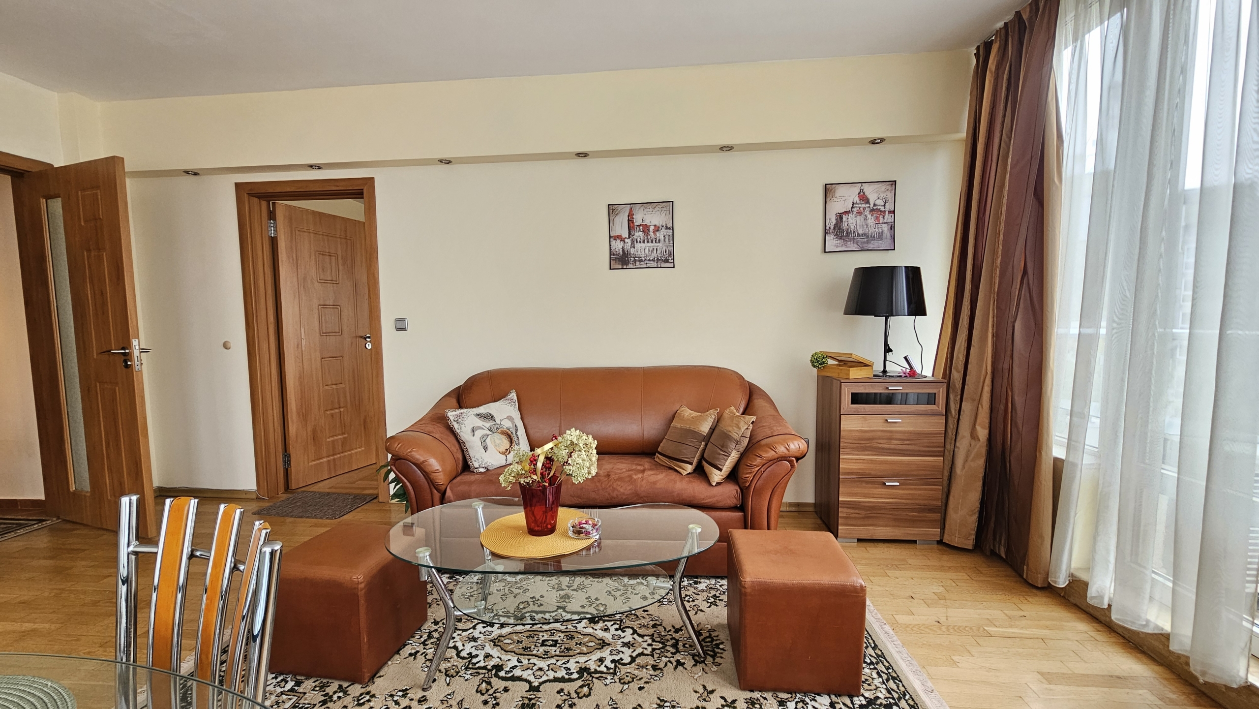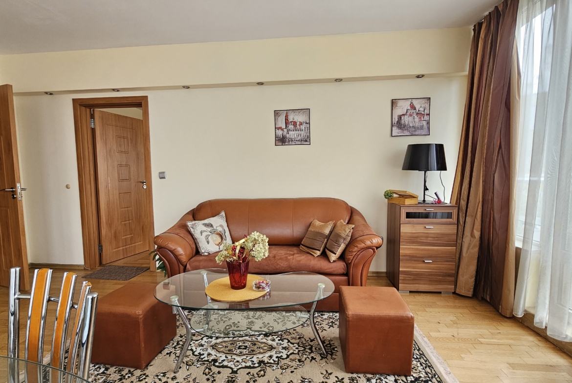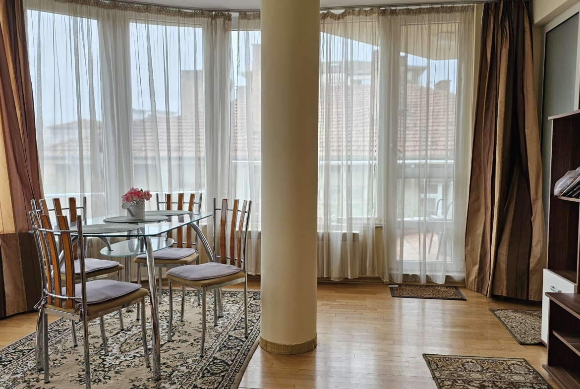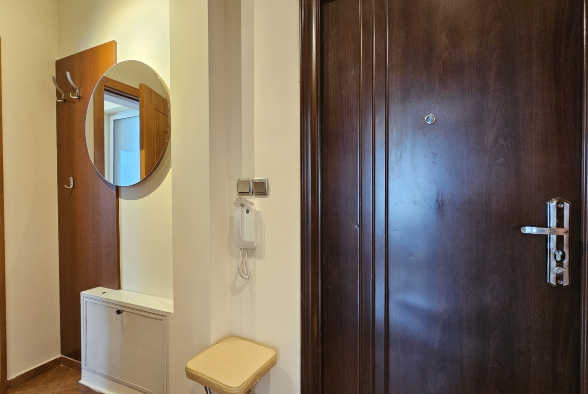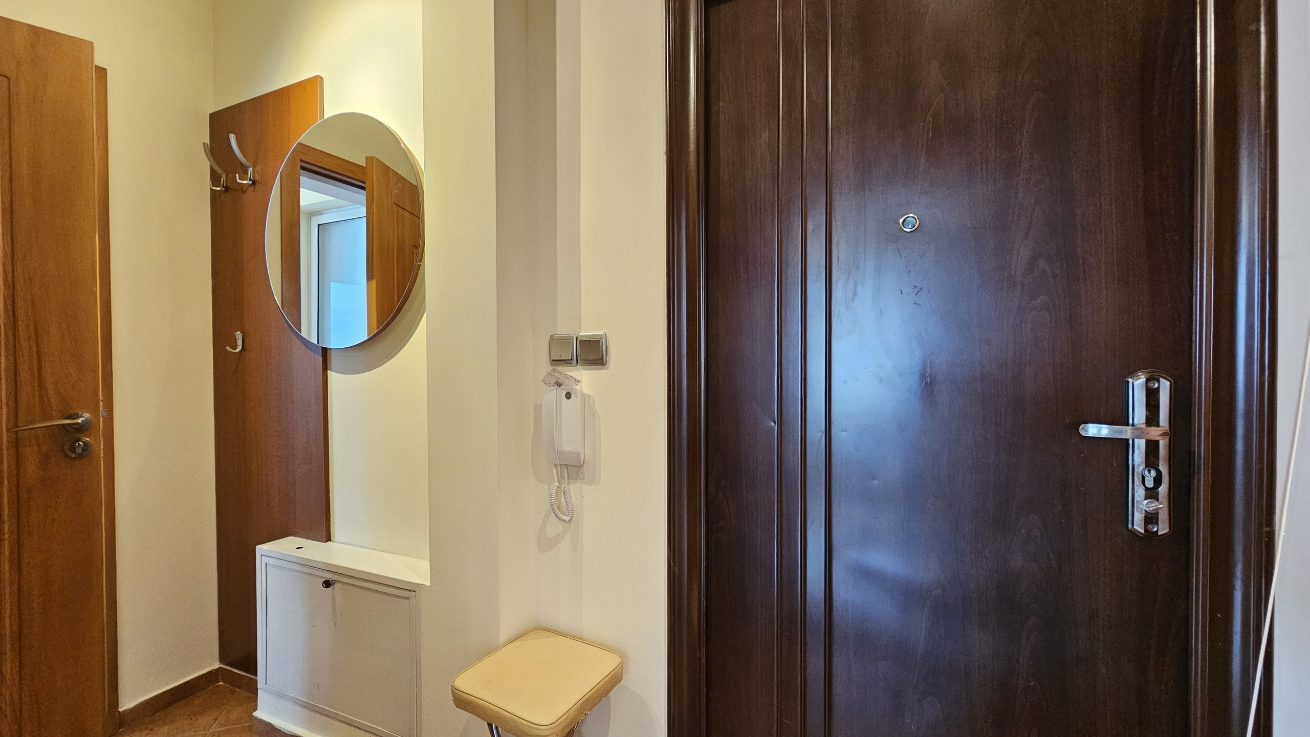 Апартаментът се отдава напълно обзаведен и оборудван с основни електроуреди. Интериорът е в светли тонове, което придава усещане за простор и уют.