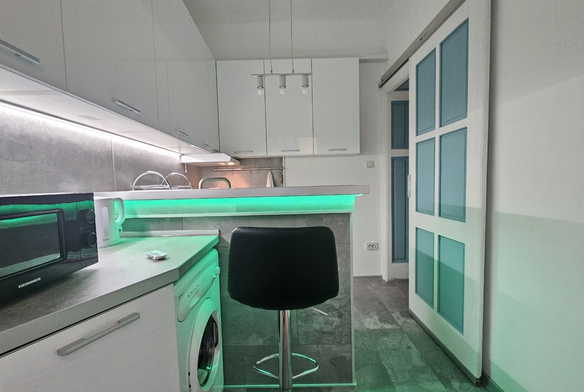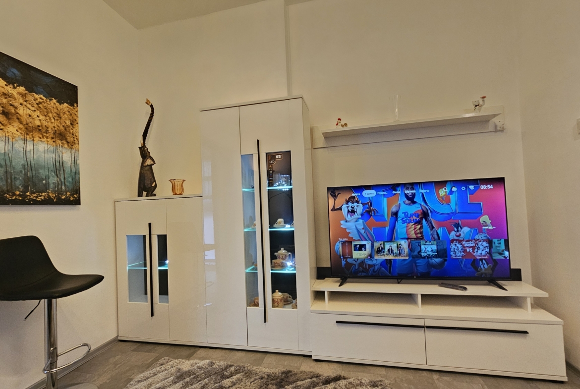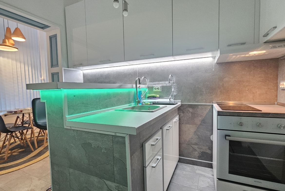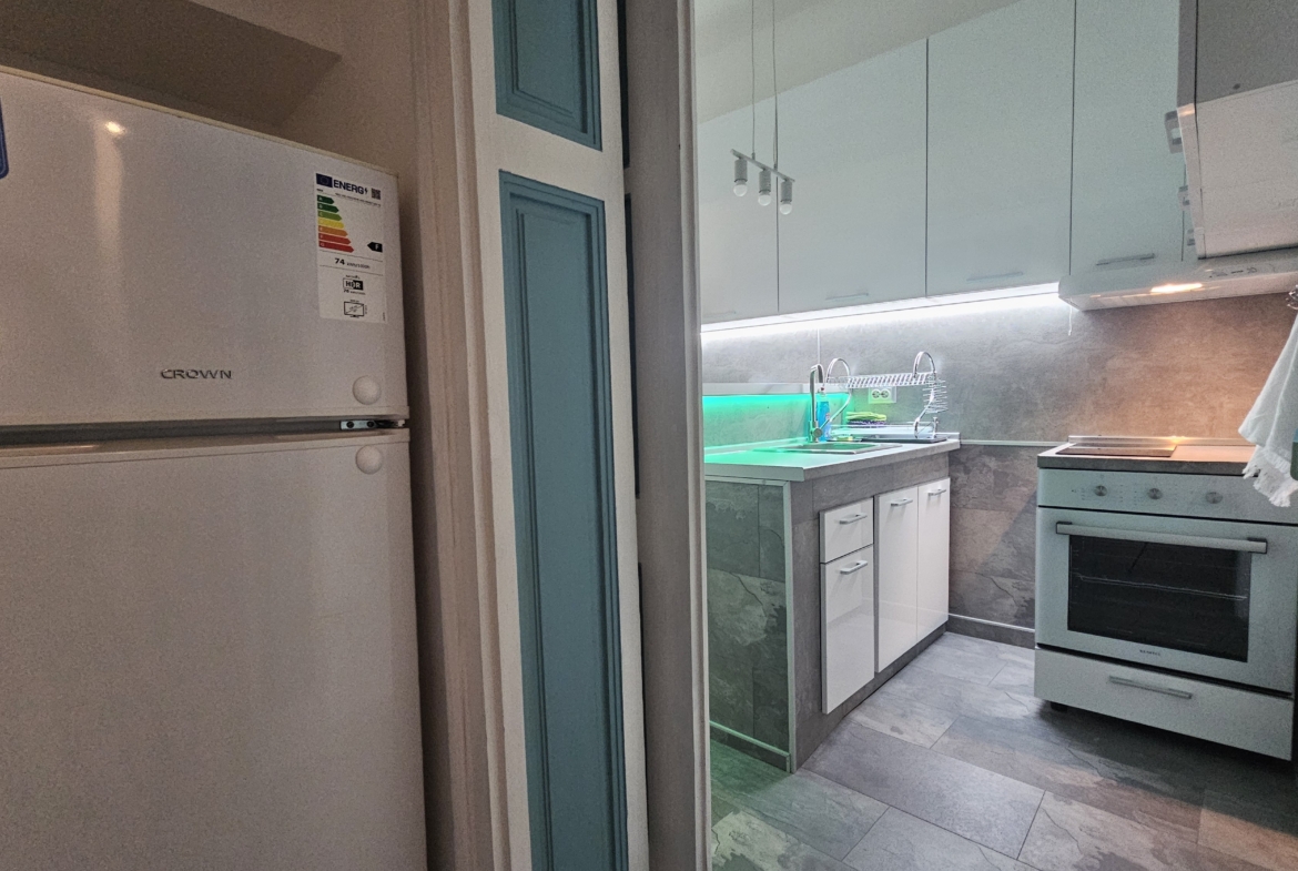 Апартаментът е изцяло обзаведен и напълно оборудван с всичко необходимо за комфортен престой. Отоплението и охлаждането са решени чрез климатици във всяка стая, което осигурява удобство през всички сезони.