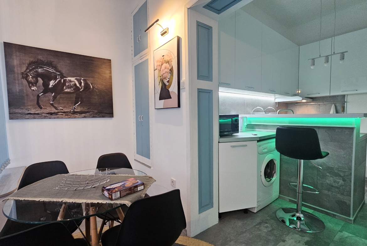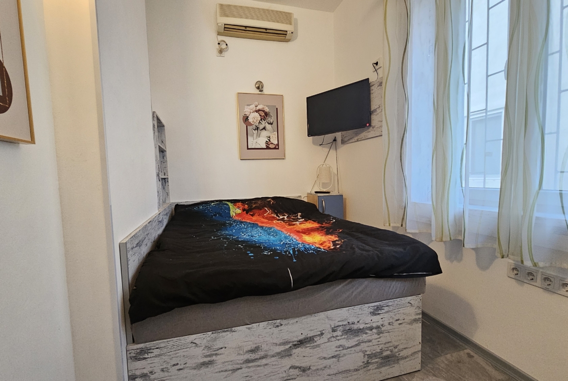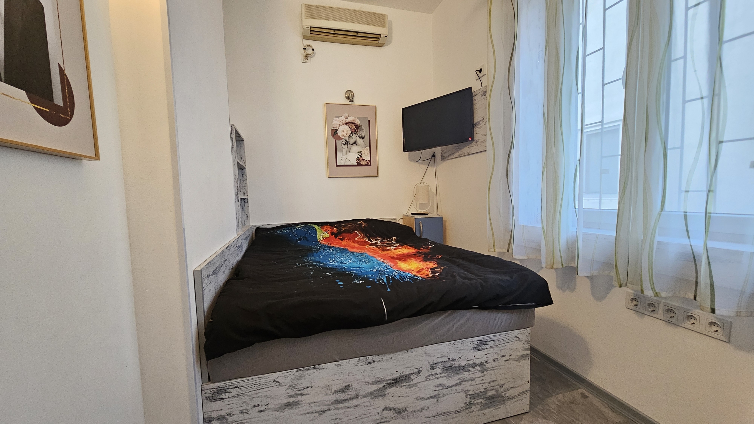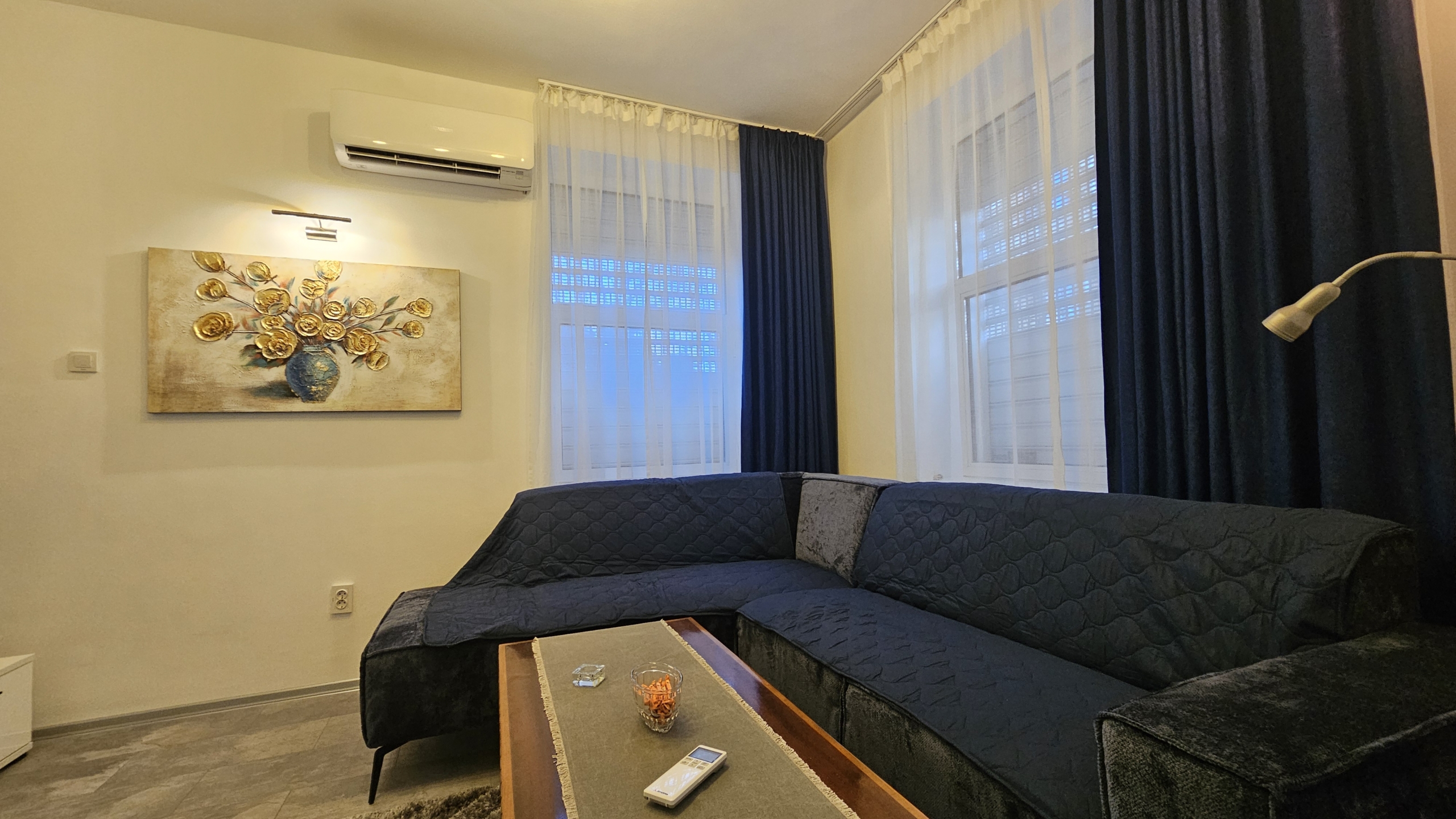 Апартаментът е изцяло обзаведен и напълно оборудван с всичко необходимо за комфортен престой. Отоплението и охлаждането са решени чрез климатици във всяка стая, което осигурява удобство през всички сезони.